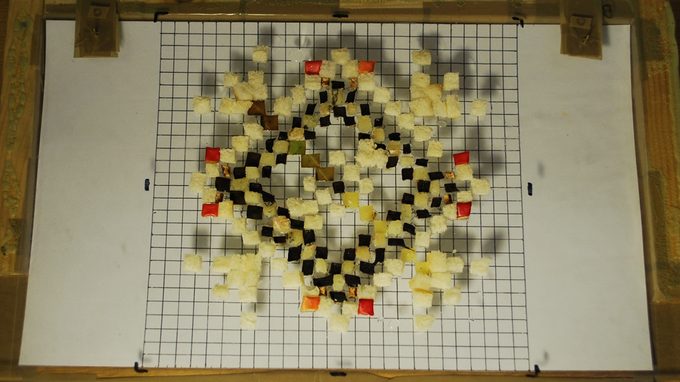Short animation, consisting of eight frames that together show one motion. The kaleidoscopic figures end up in a struggle for control with the grid.