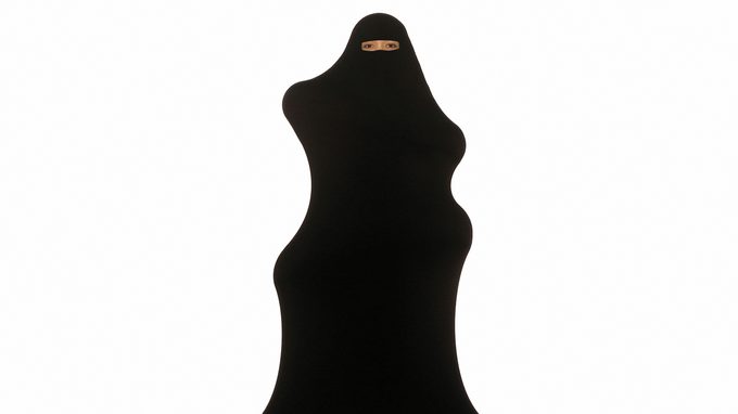 A highly elastic black burka that is fixed to the ground makes ever stranger movements against a pink background. It leans to the left, then to the right, becomes longer and shorter, thicker and thinner, and changes shape, while only the woman's eyes are visible. Accompanied by oriental music with English lyrics by the Easy Aloha's.