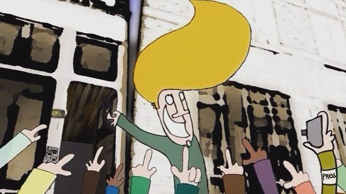 Animated film makes use of various techniques. The main character is over the moon with his new hairdo, until the town-dwellers proclaim his style the new hype.