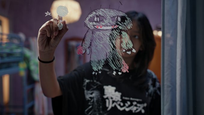Not a 'real' monster under the bed, but a self-conceived fantasy creature in a recreated bedroom. For three refugee children, their creation is a way to discuss both their nice and bad memories.