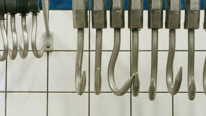 Ramsey Nasr recites Ida Gerhardt’s confrontational poem Slachtlammeren. The fear and horror it describes are at odds with the images, composed as a still life, of a still empty and quiet slaughterhouse, where immaculate hooks, aprons, shoes and a shining saw blade wait for the unwary bleating of the doomed lambs.