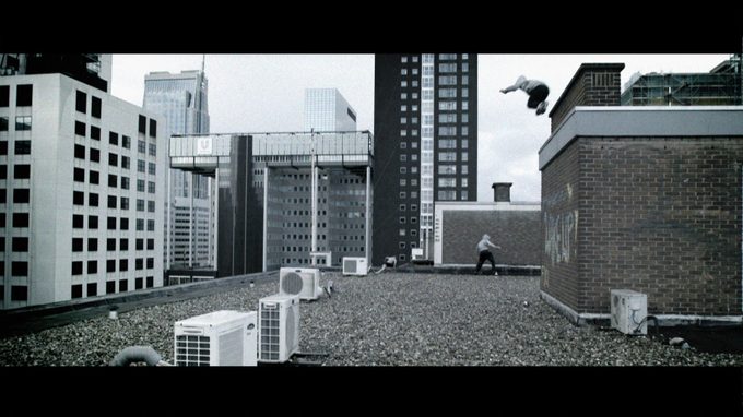 Ode in three minutes: free-run film in black-and-white depicts the art of free running against the background of architectonic Rotterdam. Three free runners in a hooded sweater 'take' the deserted city in flowing motions, with casual acrobatics, to the rhythm of a rustic soundtrack, while a window reflects security cameras.