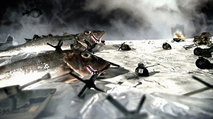 Fast edited, fictional commercial for Reinvented Action Warriors like Captain Crab and Turtigra combines live action with animation. The action heroes are made of dead animals that are brought to life and equipped with armaments. The educationally irresponsible parody, spoken in stirring American, incites children to bloodshed: 'Don't question why, just do or die.'