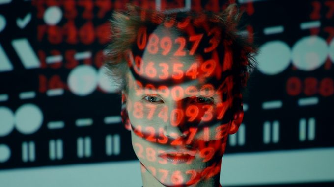 A balding cave-dweller with a giant club on his shoulder enters a room. He looks around inquisitively. On the walls, images are projected that look like cave paintings. There is a laptop in the centre of the room that arouses the caveman's interest.