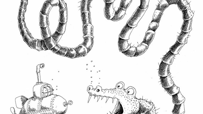 Circular story, drawn with dark ink, about an innocent girl who gets involved in an adventure with elements like a storm at sea, a choking snake and a big toe-biter.