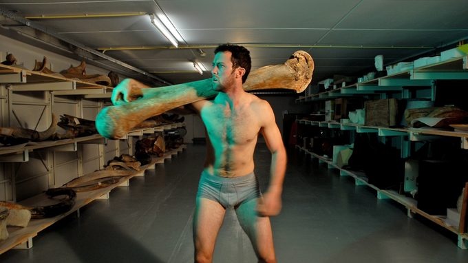 Een man, schaars gekleed in een strakke onderbroek, tilt van alles op, van oude botten tot stofzuigers. De voice-over vertelt over een uitstervende diersoort.