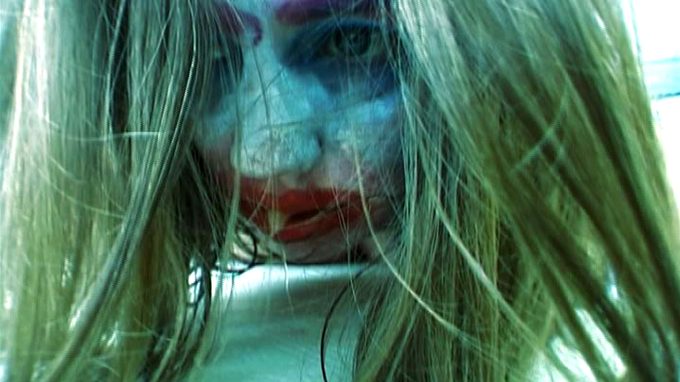 Soms in slowmotion, afwisselend voorwaarts en achterwaarts afgespeeld, beweegt een vrouw haar wit geschminkte gezicht met rode lippen. Ze ligt voorover op de witte grond, met de armen uit elkaar en de borsten platgedrukt tegen de vloer, heft haar hoofd op en schudt het heen en weer. Rood, blauw en paars zijn om haar ogen en mond gesmeerd. Haar gezicht bevindt zich vlakbij de camera, in close-up bewegen haar haren, terwijl ze een grommend, zwaar ademend geluid maakt.