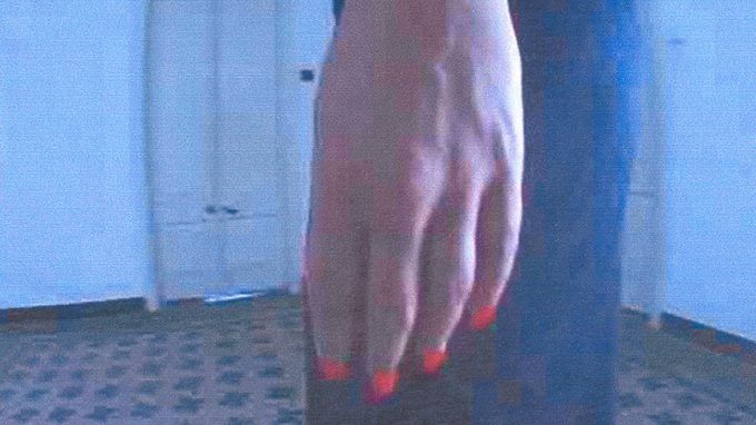Korte film waarin een vrouw met blote voeten op een tegelvloer staat. In slowmotion draait de camera onderzoekend om haar heen en belaagt haar.