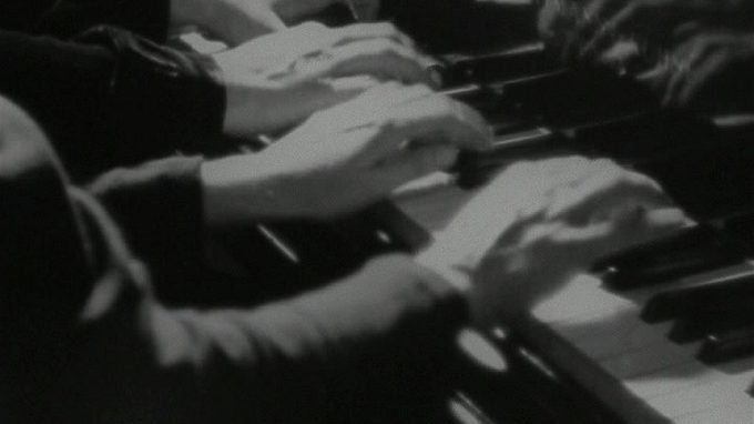Twee dames spelen quatre-mains op de piano het stuk Jeux d'enfants van Georges Bizet.