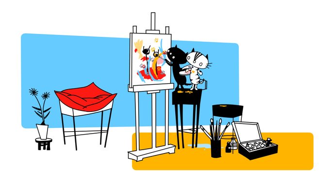 De vrouw schildert een portret van Pim en Pom. Volgens Pim en Pom lijkt het niet en kunnen zij het veel beter.