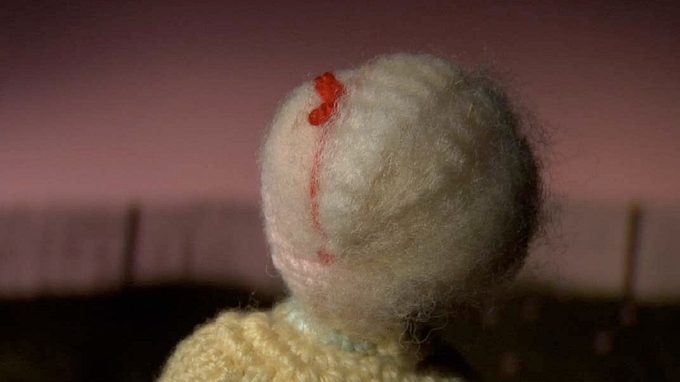 Een wollen jongetje beschermt een vrouw in een rolstoel tegen een stel wollen honden.